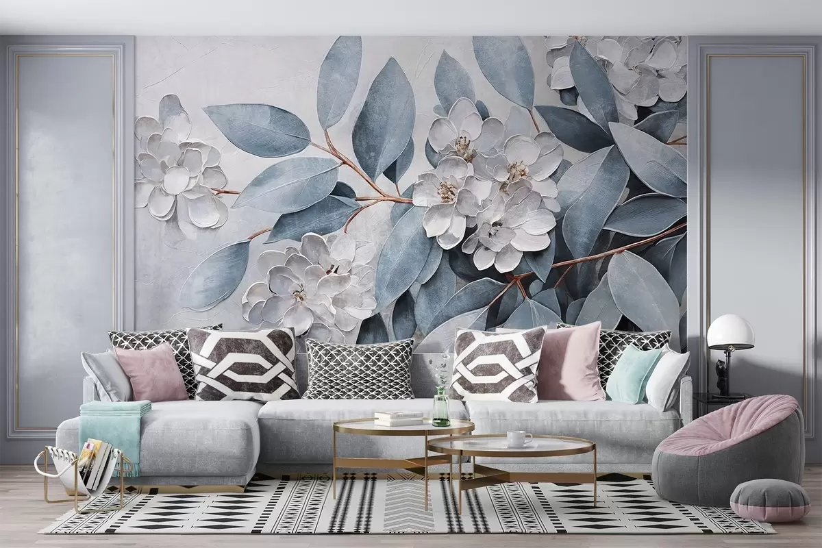 Фототапет Нежни бели цветя със сиво-зелени листа на мек, приглушен фон в стил маслена живопис Nr w08437