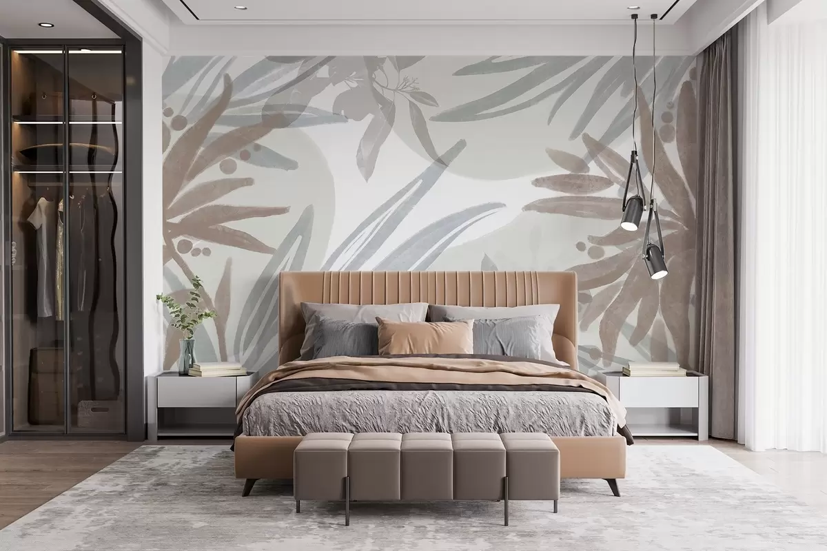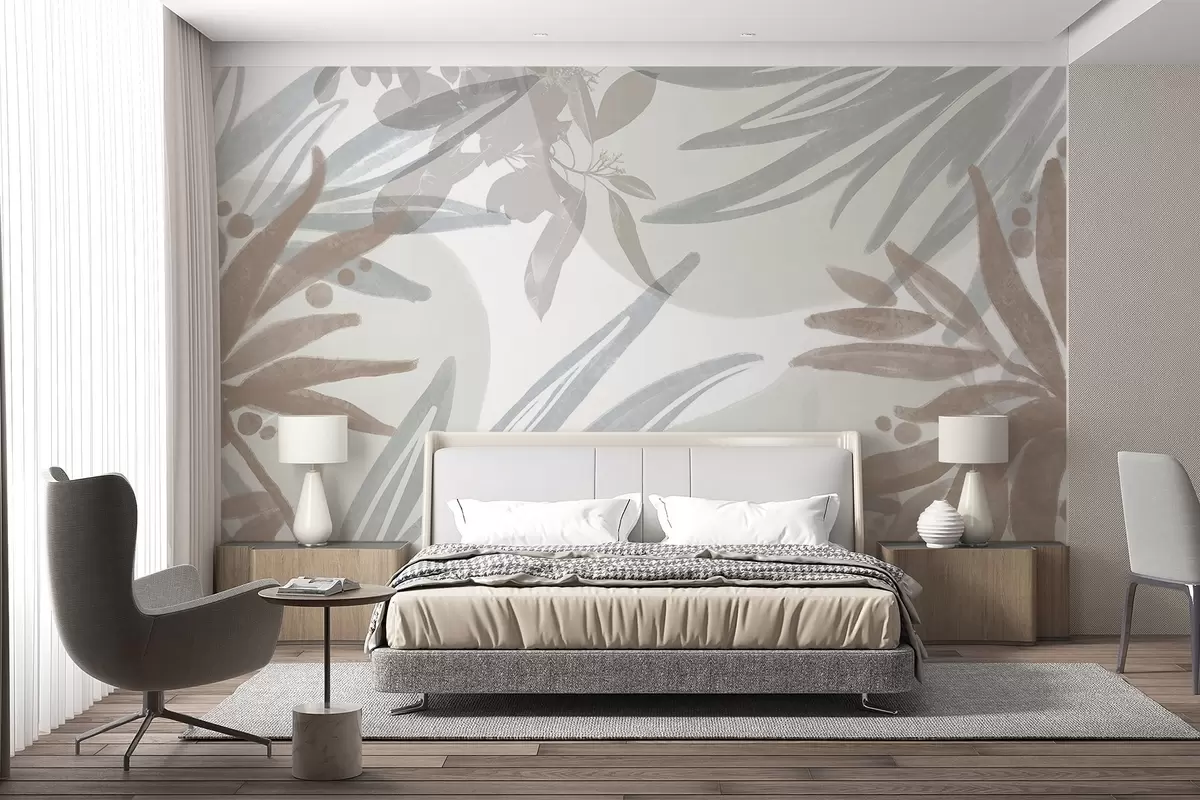 Фототапет Абстрактен флорален десен в неутрални тонове с припокриващи се листа и форми в нюанси на сиво , бяло и бежово Nr w08464