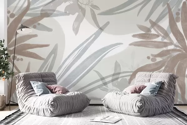 Фототапет Абстрактен флорален десен в неутрални тонове с припокриващи се листа и форми в нюанси на сиво , бяло и бежово Nr w08464