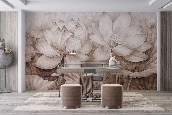 Фототапет Няколко детайлно текстурирани големи бежови лотосови цветя с кафяви листа и стъбла на светъл фон Nr w08465v1