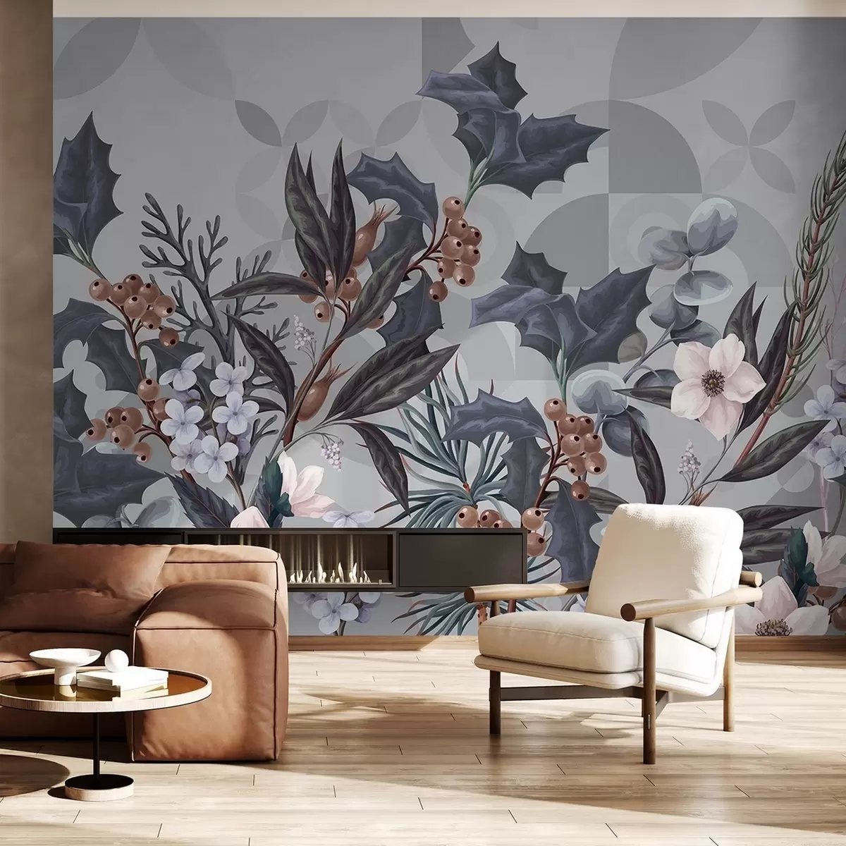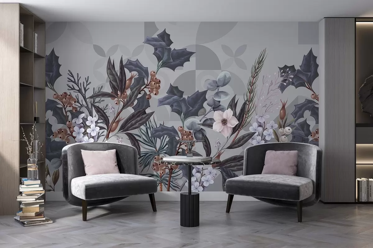 Фототапет Флорална композиция с големи тъмни листа, цветя и плодове върху приглушен сив геометричен абстрактен фон Nr w08525