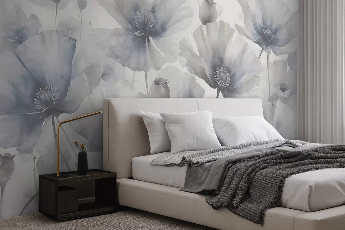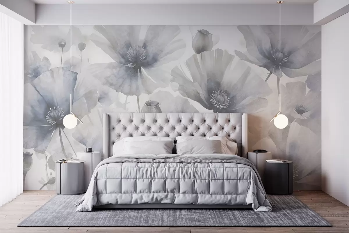 Фототапет Деликатни текстурни гръндж сиви и бели цветя с меки, размазани венчелистчета на бял фон Nr w08526