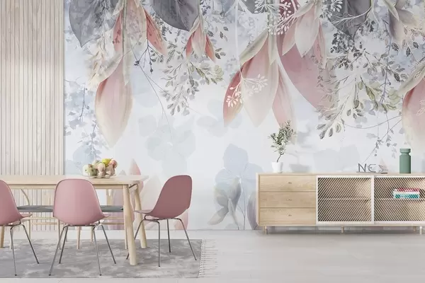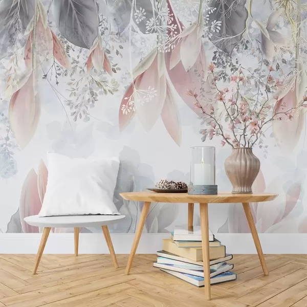 Фототапет Мека флорална щампа в пастелни цветове с нежни венчелистчета и листа в розови, бели и сиви нюанси Nr w08538