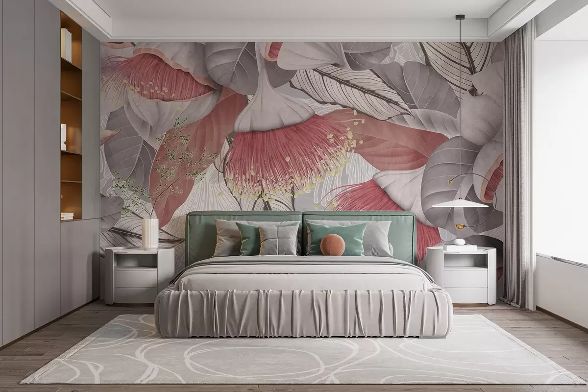 Фототапет Ботаническа илюстрация на големи цветове евкалипт с дълги тичинки на сив и бял фон Nr w08539