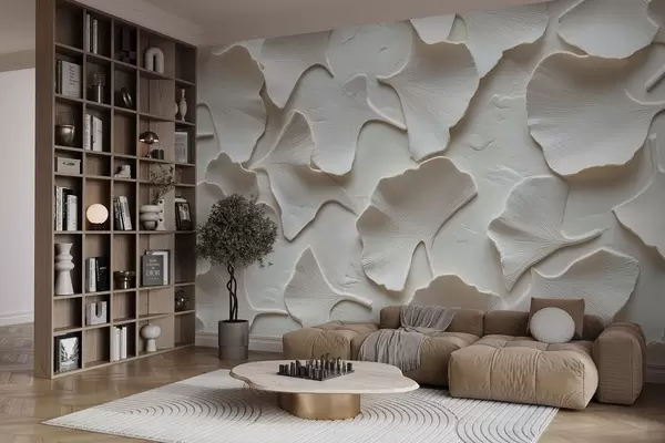Фототапет Мазилка с деликатно релефно изображение на листа от гинко на бял фон Nr w08560v1