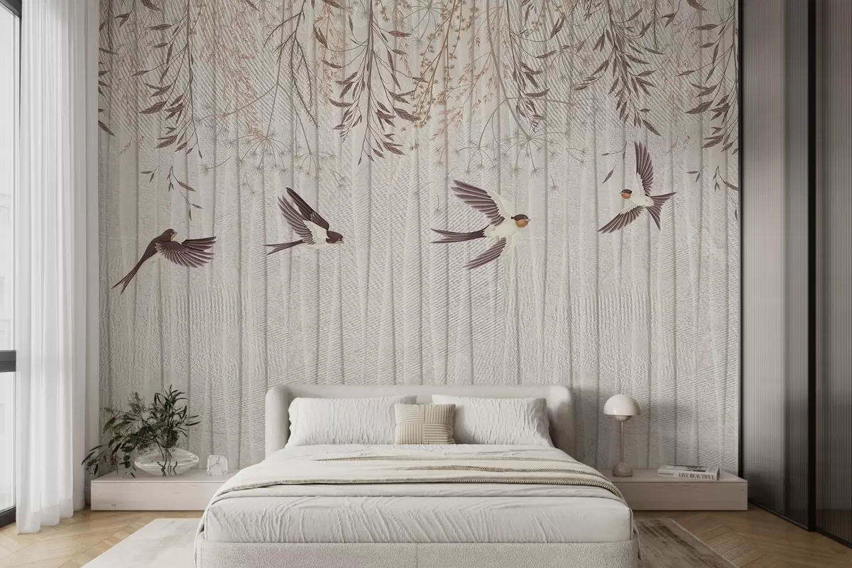 Фототапет Летящи птици на текстуриран фон с глухарчета и цветя Nr w08566