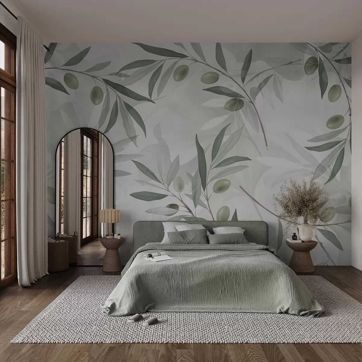 Фототапет Маслинови клонки със зелени листа и маслини на светъл фон Nr w08576