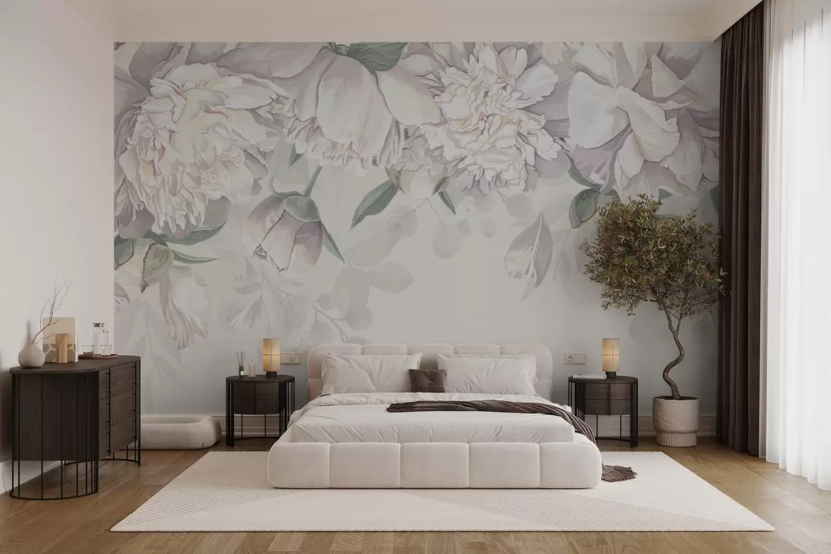 Фототапет Нежни бели и розови пастелни божури със зелени листа, аранжирани в мек, романтичен цветен фон Nr w08577