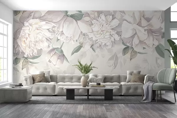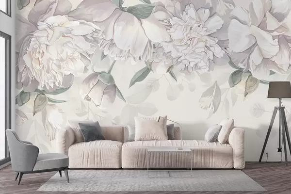 Фототапет Нежни бели и розови пастелни божури със зелени листа, аранжирани в мек, романтичен цветен фон Nr w08577