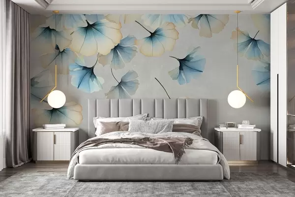 Фототапет Пастелни сини и жълти листа от гинко с нежни листенца, които се носят във въздуха на текстурен фон Nr w08578v1