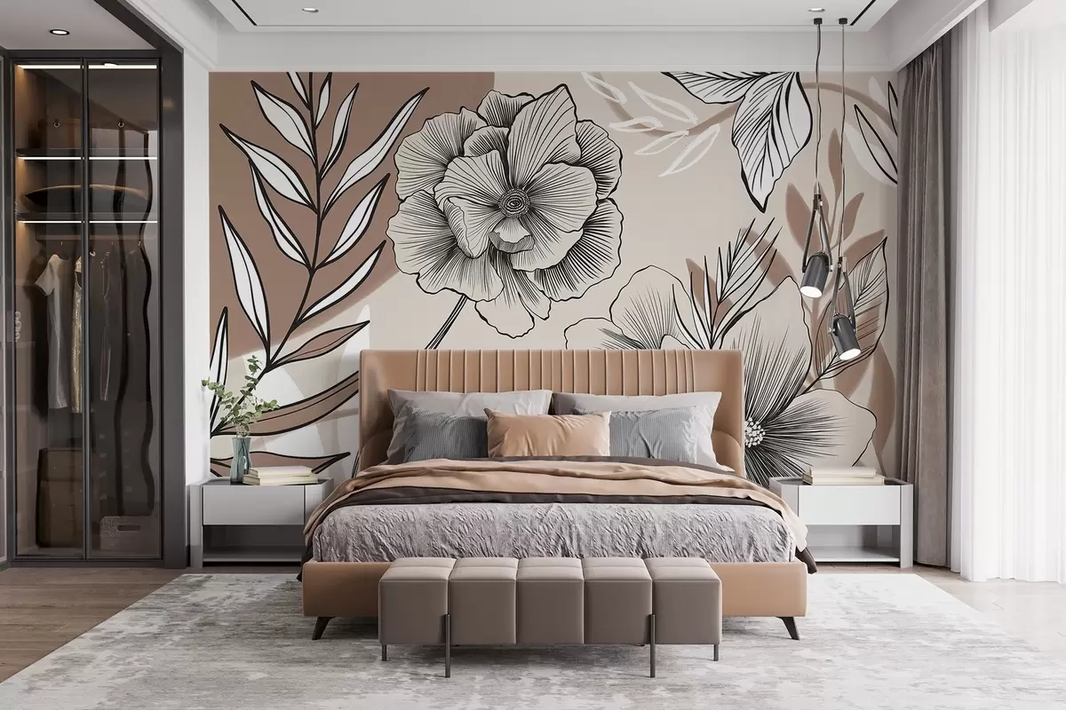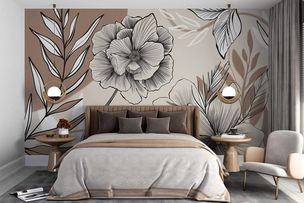 Фототапет Големи черно-бели графични цветя с подробни листа на бежов абстрактен фон Nr w08580