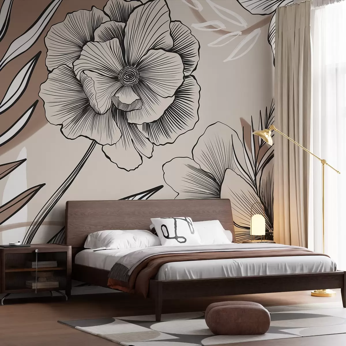 Фототапет Големи черно-бели графични цветя с подробни листа на бежов абстрактен фон Nr w08580