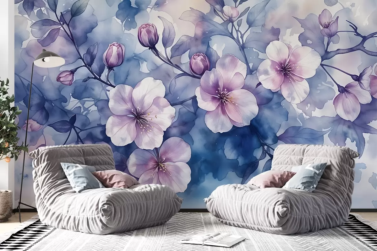 Фототапет Деликатна акварелна имитация на розови и лилави цветя с меки, размити венчелистчета на син фон с пръски Nr w08582