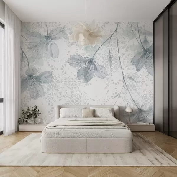 Фототапет Нежни сини и бели цветя с дълги стъбла и венчелистчета на мек, размазан текстурен фон Nr w08588