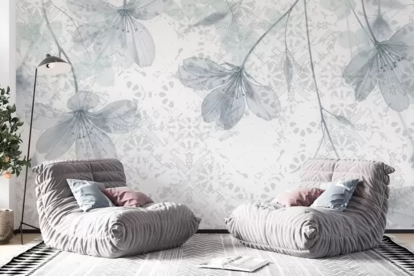 Фототапет Нежни сини и бели цветя с дълги стъбла и венчелистчета на мек, размазан текстурен фон Nr w08588
