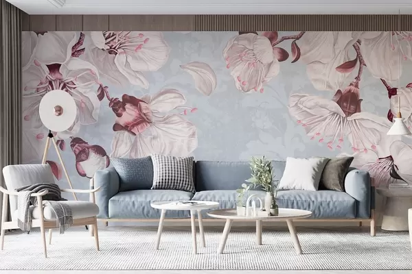 Фототапет Флорален принт с големи розови и бели цъфтящи черешови цветя на светлосин текстурен фон w08601