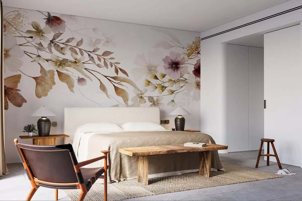Фототапет Цветна аранжировка в меки, приглушени цветове с бежови и бели цветя и листа на светъл фон Nr w08603