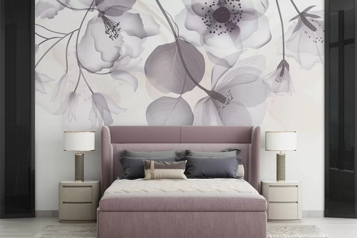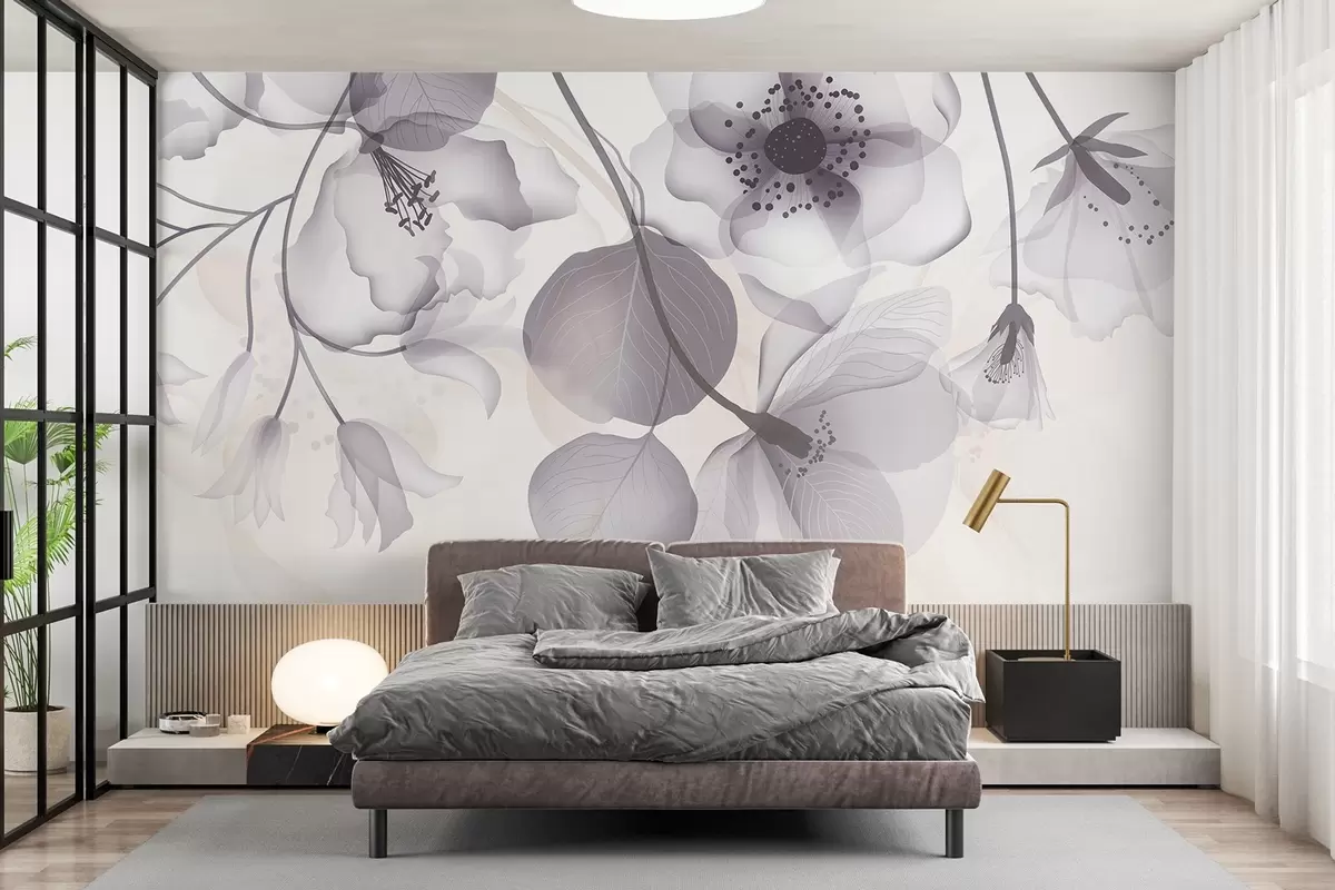 Фототапет Нежни сиви и бежови полупрозрачни цветя с меки венчелистчета и тъмни центрове на светъл фон Nr w08613v2