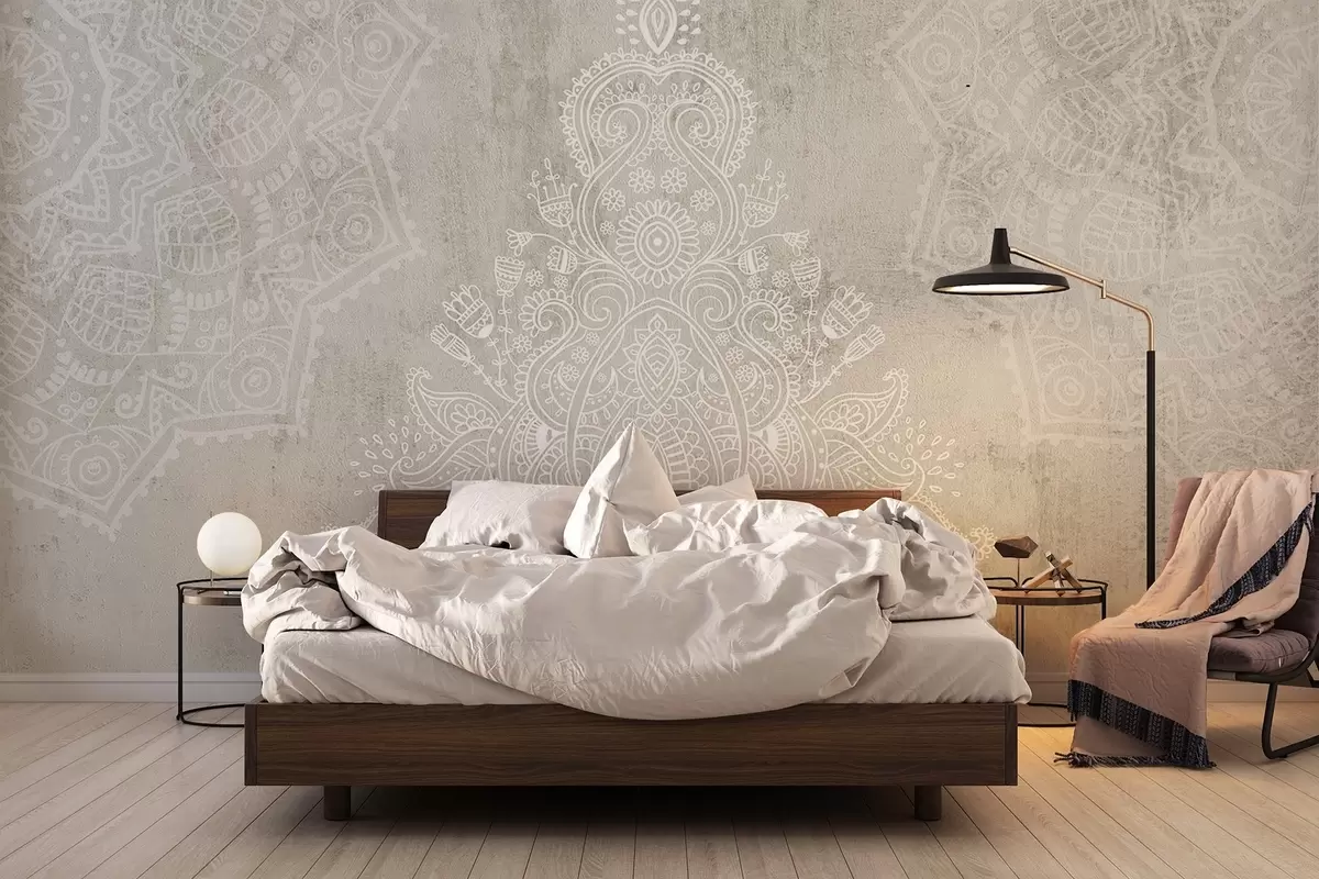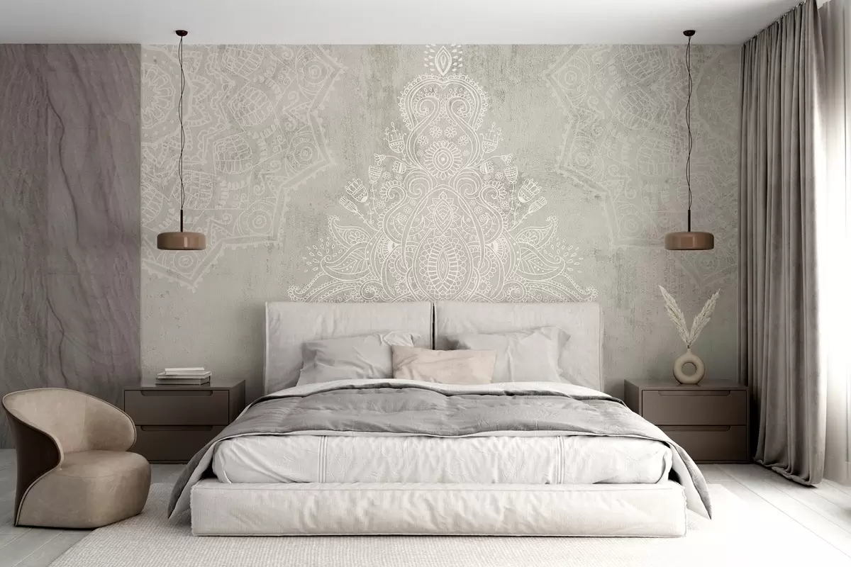 Фототапет Детайлен, сложен принт на бяла дантела мандала на светлобежов абстрактен фон с текстура Nr w08614