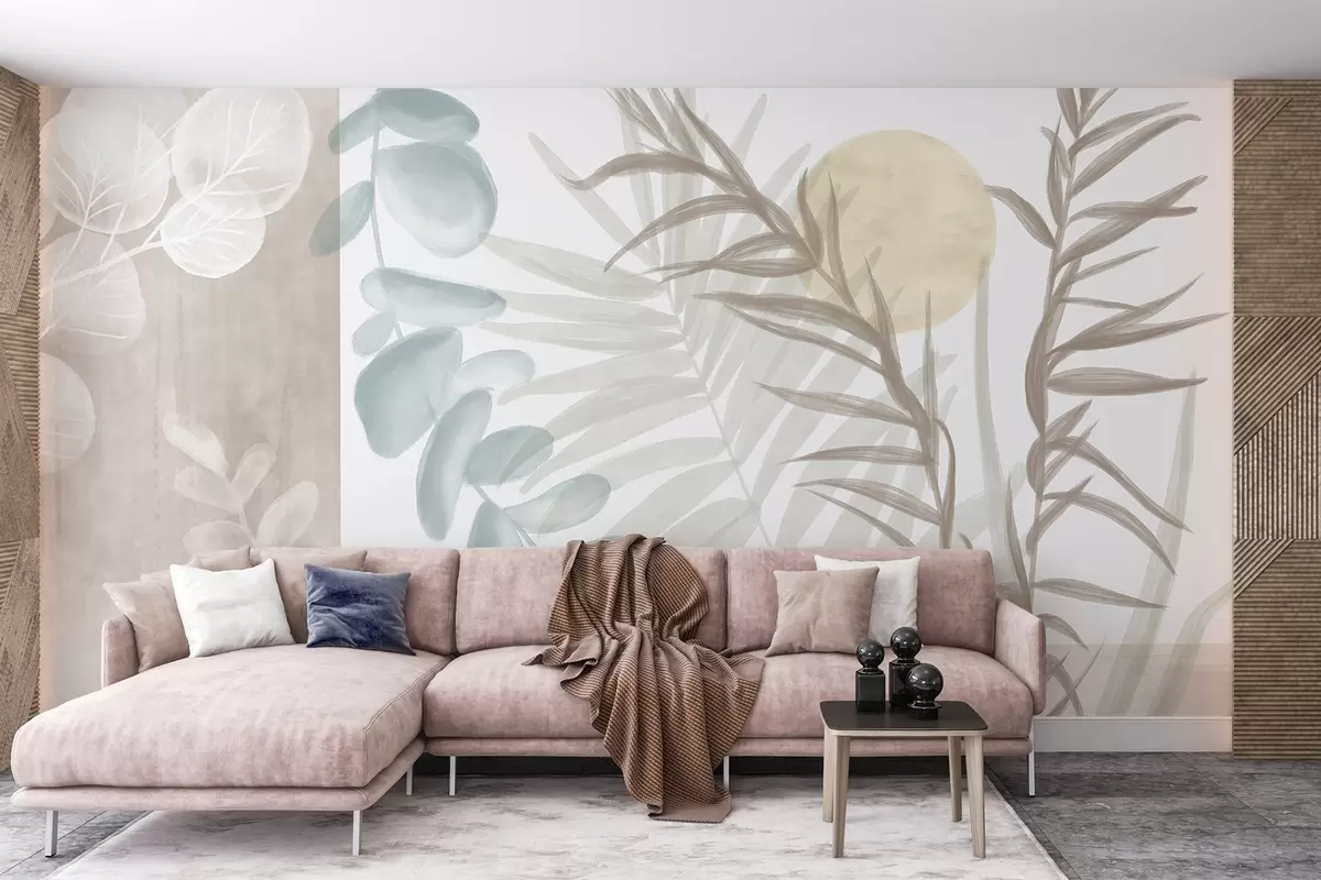 Фототапет Минималистичен абстрактен принт със стилизирани листа и евкалипт с меки, бежови органични форми в приглушени пастелни цветове Nr w08648