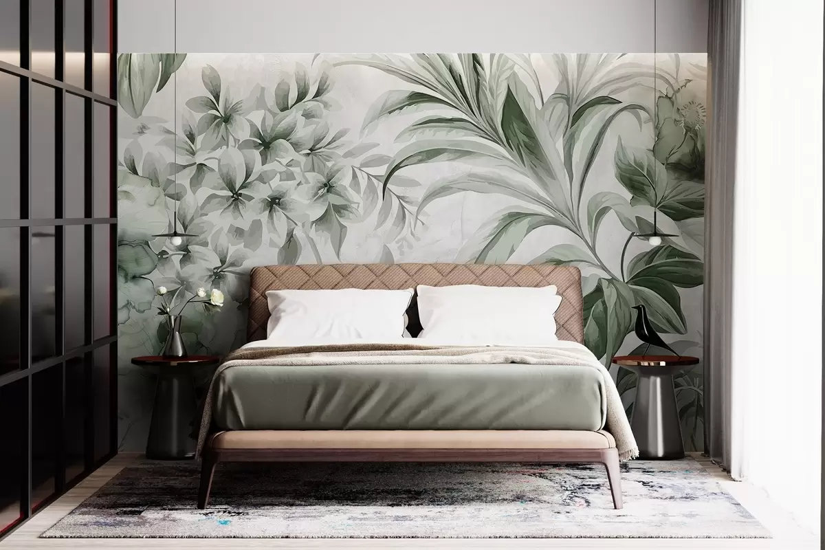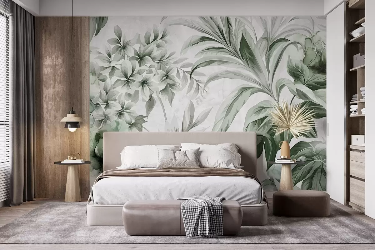 Фототапет Тропически листа и зеленина в приглушена палитра от светли до тъмни нюанси на зелено върху текстуриран светъл фон Nr w08650