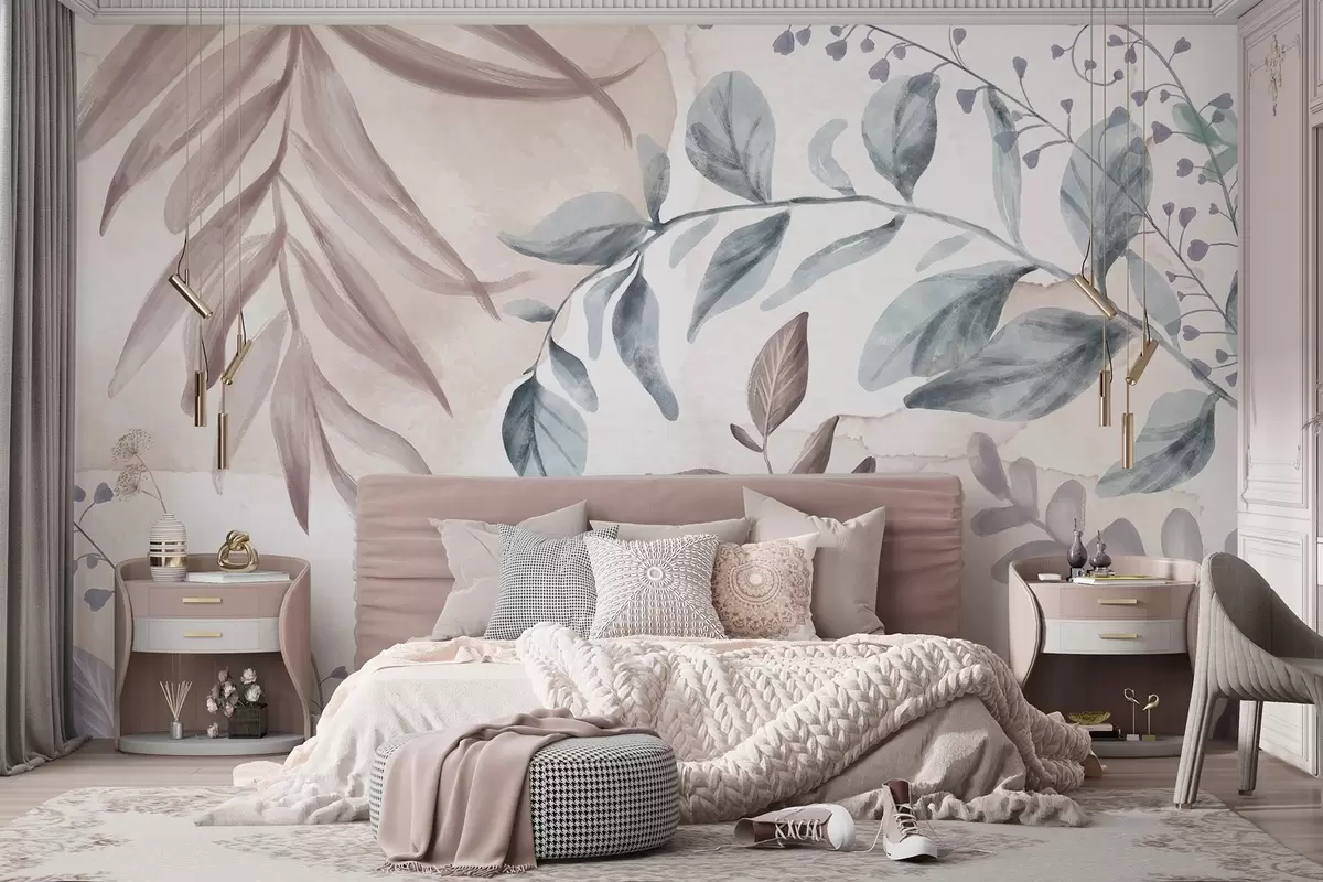 Фототапет Ботанически принт с листа и флорални клонки в меки пастелни цветове на фон, наподобяващ акварел Nr w08668