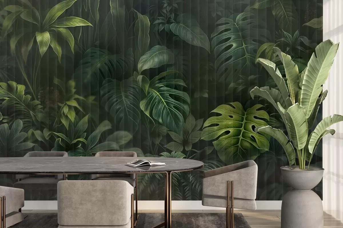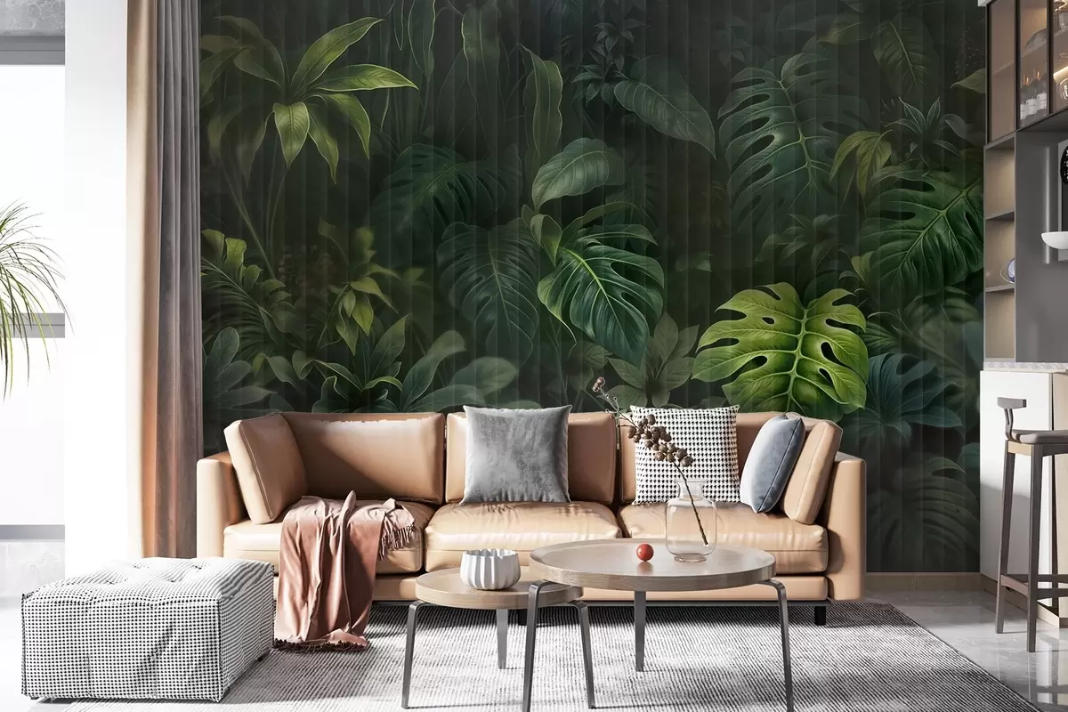 Фототапет Тропически тъмен размазан и текстуриран отпечатък с различни зелени листа, включително монстера и палмови листа Nr w08673