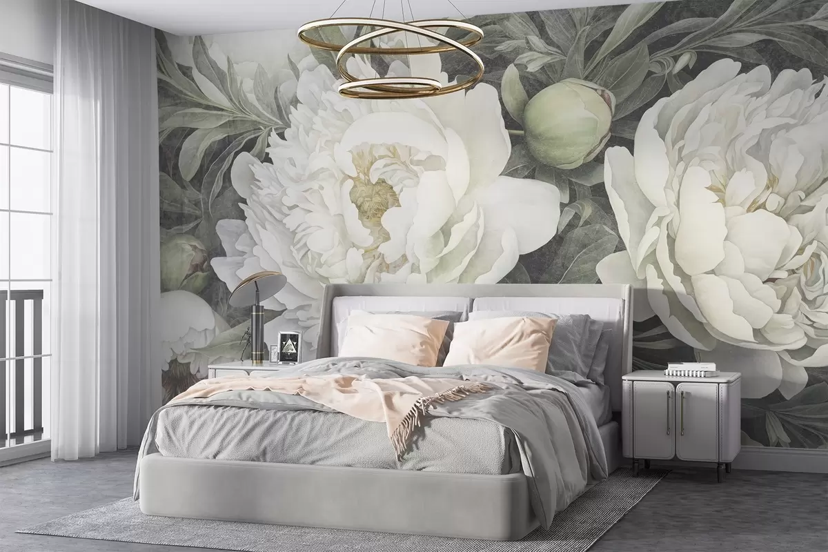 Фототапет Текстурирани пастелни бели божури с меки зелени пъпки и листа с нежни венчелистчета Nr w08697