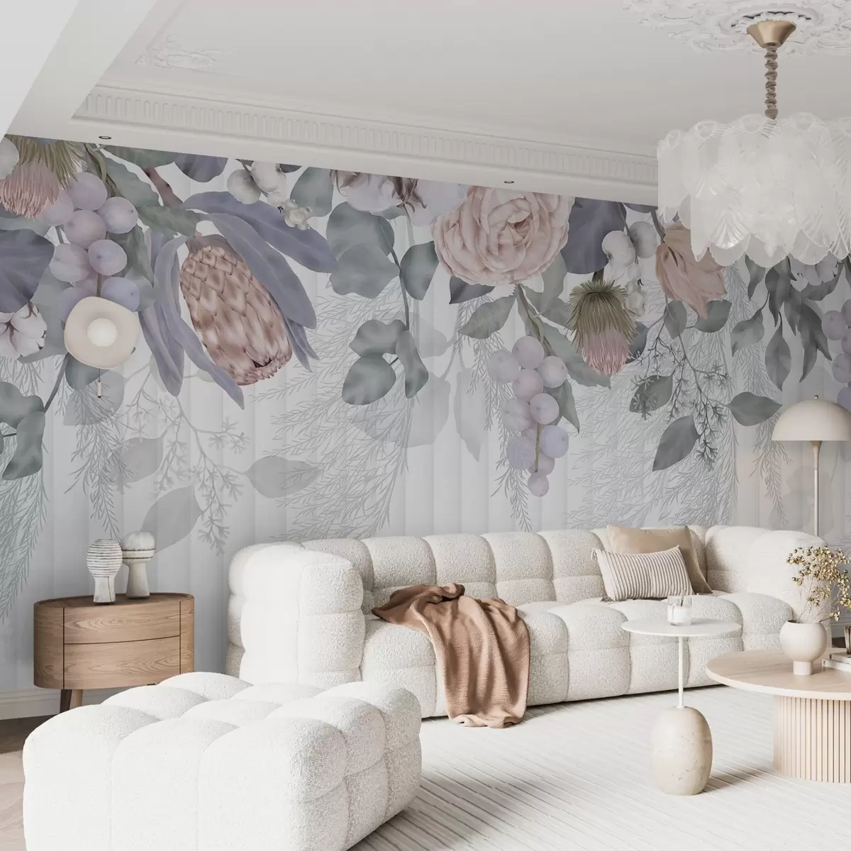 Фототапет Цветни розови рози в пастелни цветове, цветя от протея, евкалиптови клонки и плодове на текстуриран фон Nr w08700