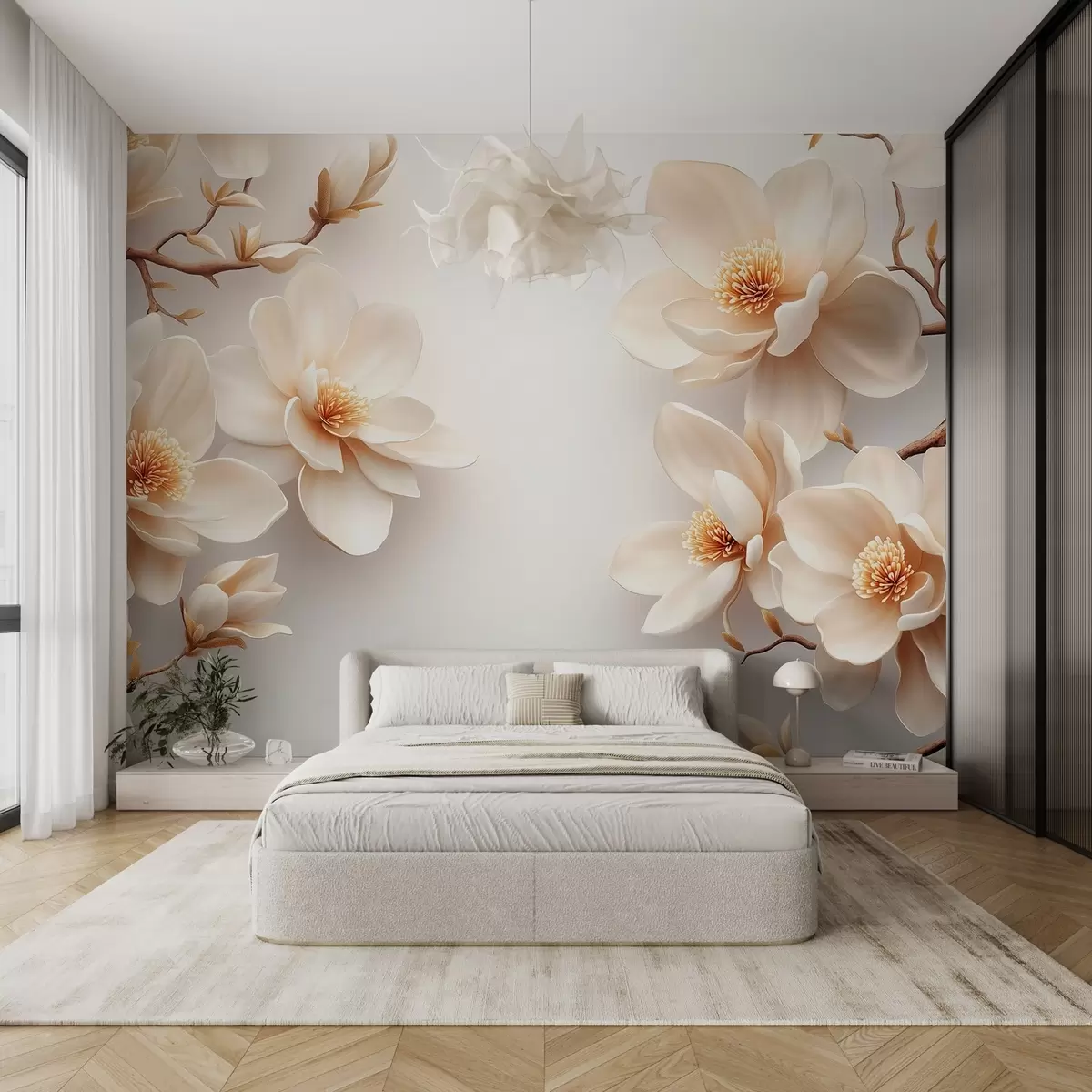 Фототапет Красиви цъфтящи кремави цветя магнолия на бял фон Nr w08704