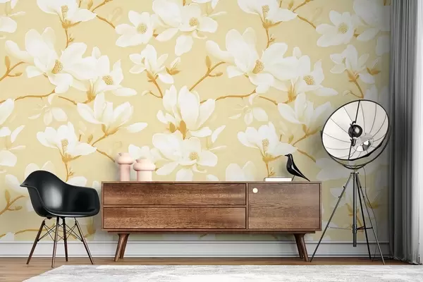 Фототапет Модел от бели цветове на магнолия в жълти нюанси, бели листа и клони Nr w08726v3