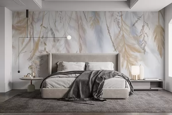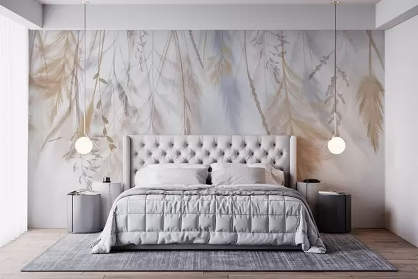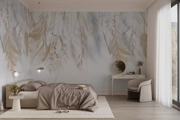 Фототапет Деликатни треви, шишарки и растения в пастелни тонове, подредени в каскаден принт на блед фон Nr w08737