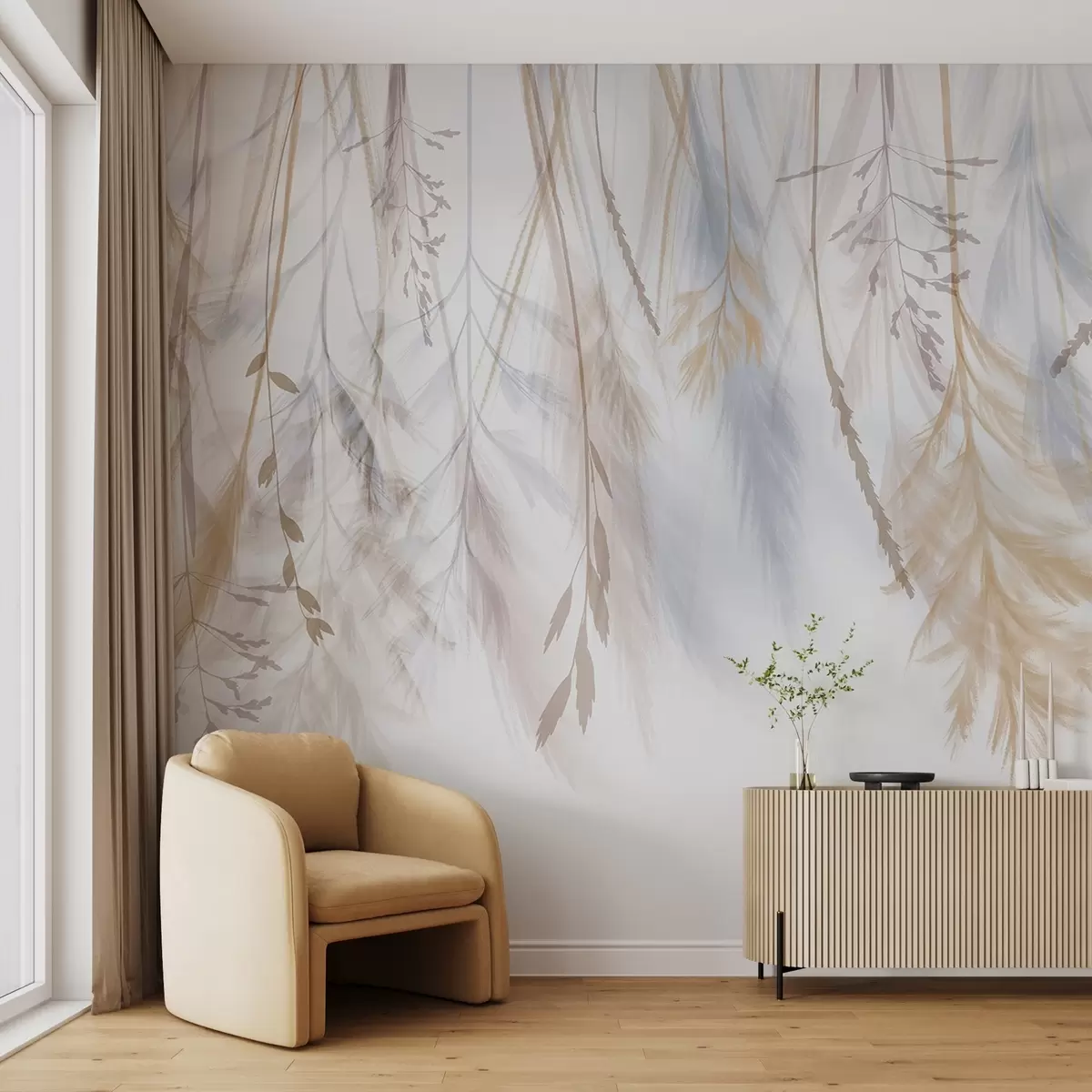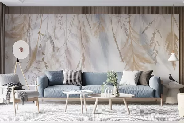 Фототапет Деликатни треви, шишарки и растения в пастелни тонове, подредени в каскаден принт на блед фон Nr w08737