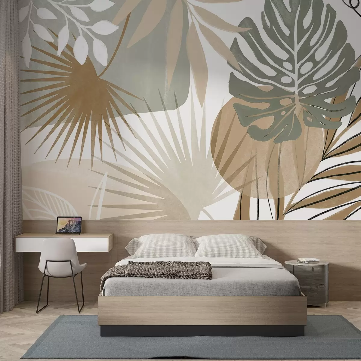 Фототапет Абстрактен дизайн с различни тропически листа в земни тонове на зелено, бежово и кремаво Nr w08738v1