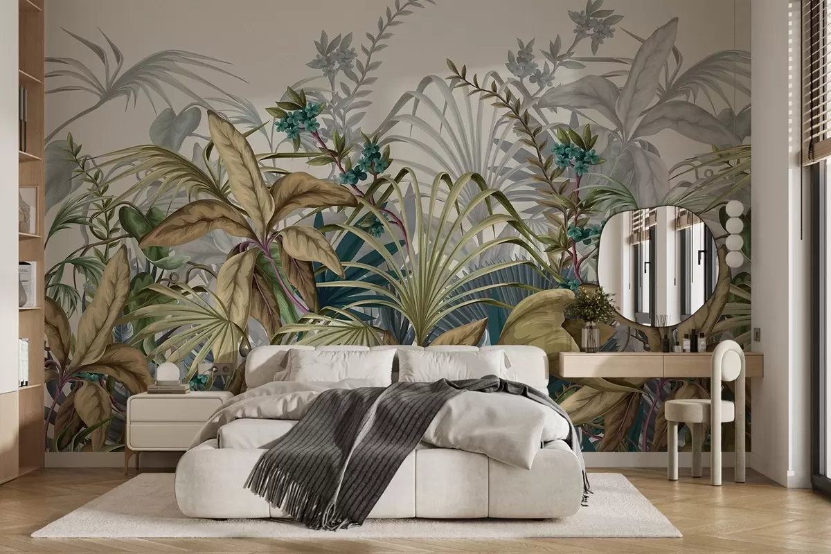 Фототапет Аранжировка от различни тропически растения с големи живи листа, създаващи пищна зелена сцена върху светлобежов цвят Nr w08777v1