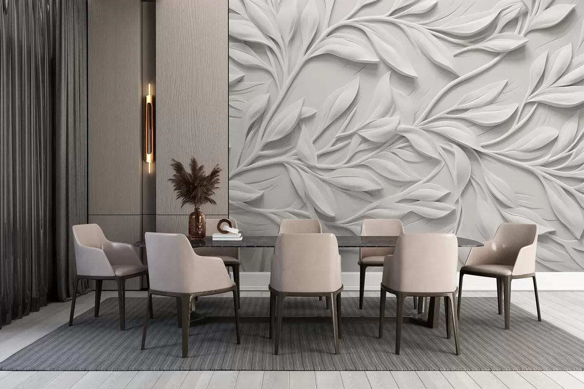 Фототапет Бяла текстурирана щампа с листа и клони , създаваща ефект на обемна имитация върху текстуриран фон Nr w08778