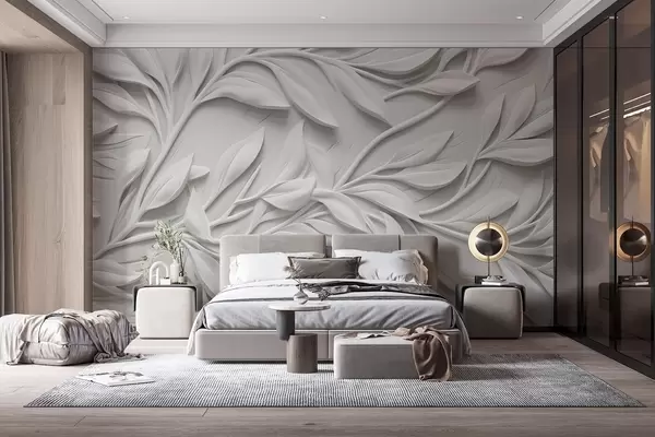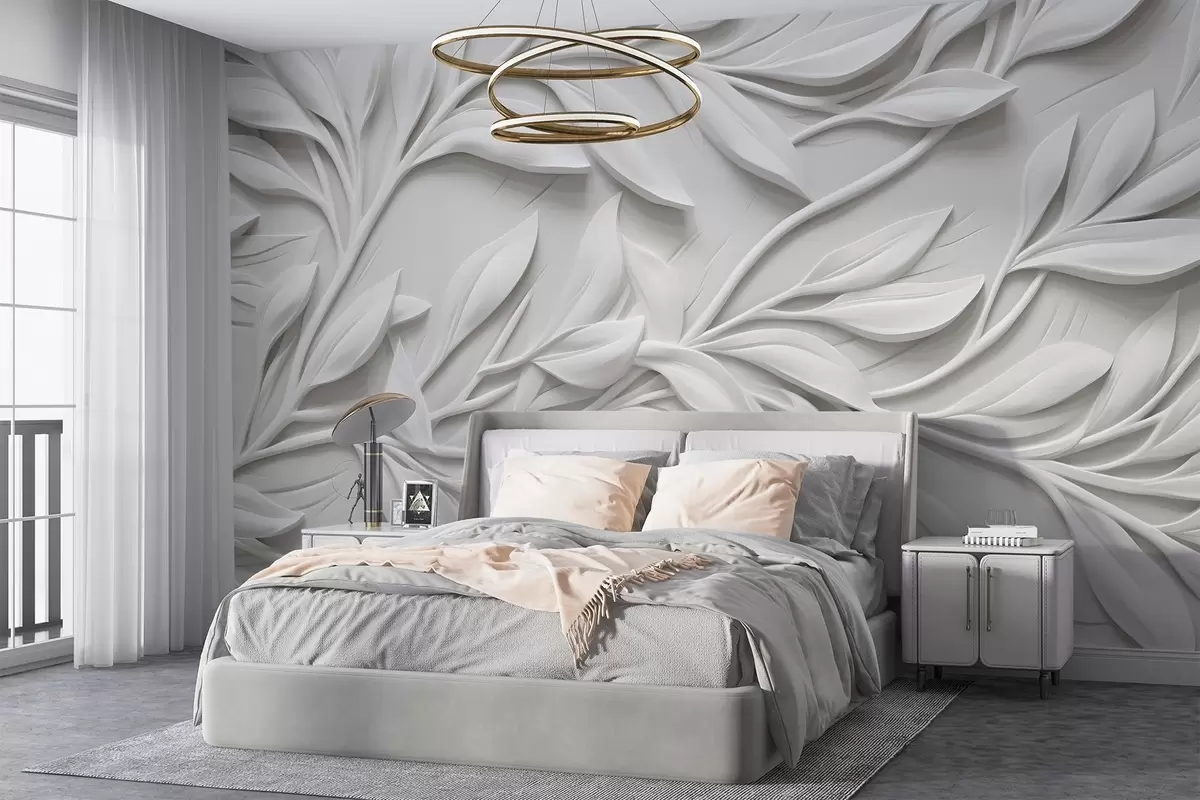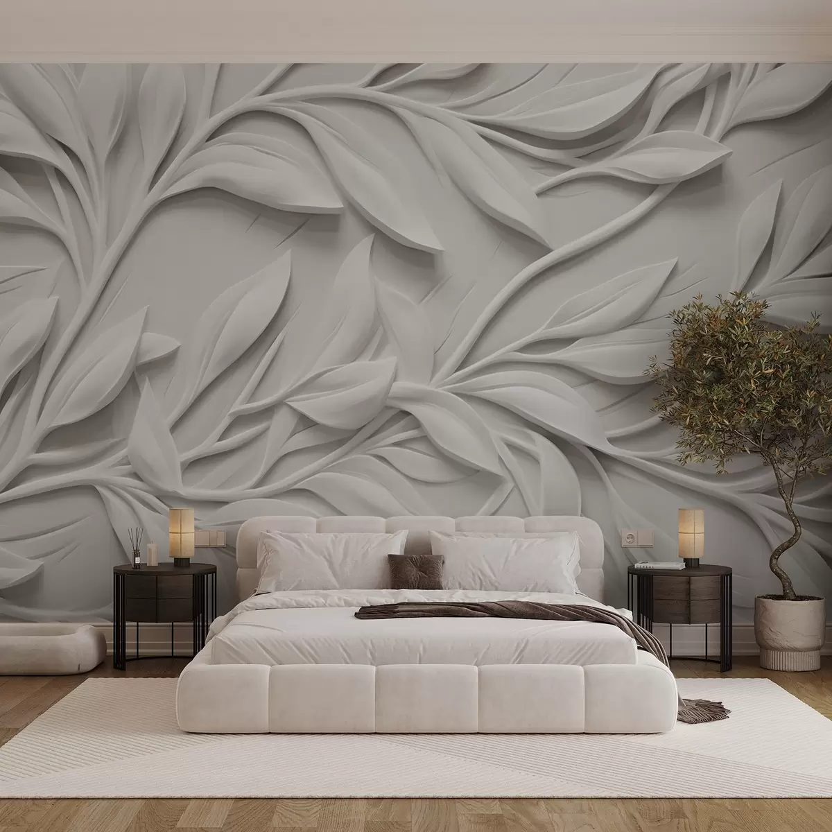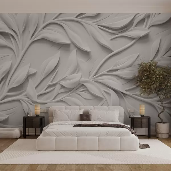 Фототапет Бяла текстурирана щампа с листа и клони , създаваща ефект на обемна имитация върху текстуриран фон Nr w08778
