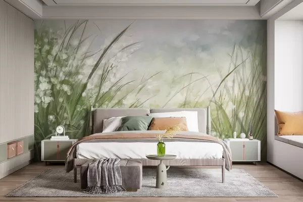 Фототапет Пищна зелена трева с нежни бели цветя, меко размазан печат със светли нюанси, създаващ спокоен пейзаж Nr w08779