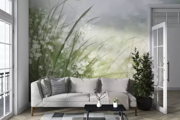Фототапет Пищна зелена трева с нежни бели цветя, меко размазан печат със светли нюанси, създаващ спокоен пейзаж Nr w08779