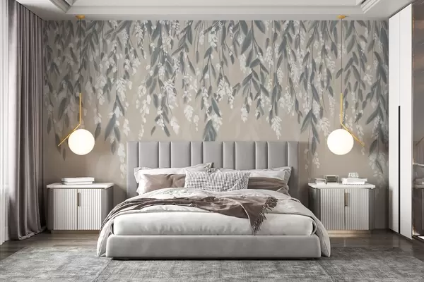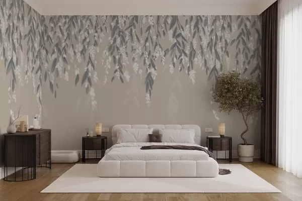 Фототапет Каскадни листни клони в нюанси на приглушено зелено с бели цветове и листа на бежов фон Nr w08781