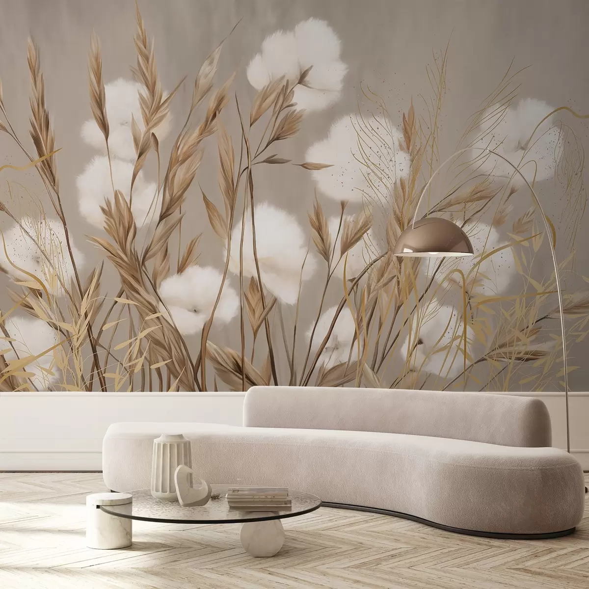 Фототапет Меки, пухкави памучни бели цветя и високи оранжеви треви на фона на приглушена бежова текстура Nr w08784