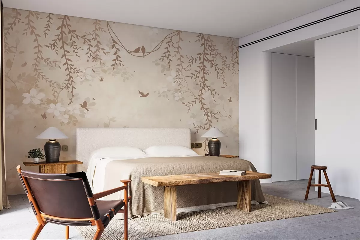 Фототапет Птици с висящи растения и флорален десен в светли бежово-кремави тонове Nr w08809