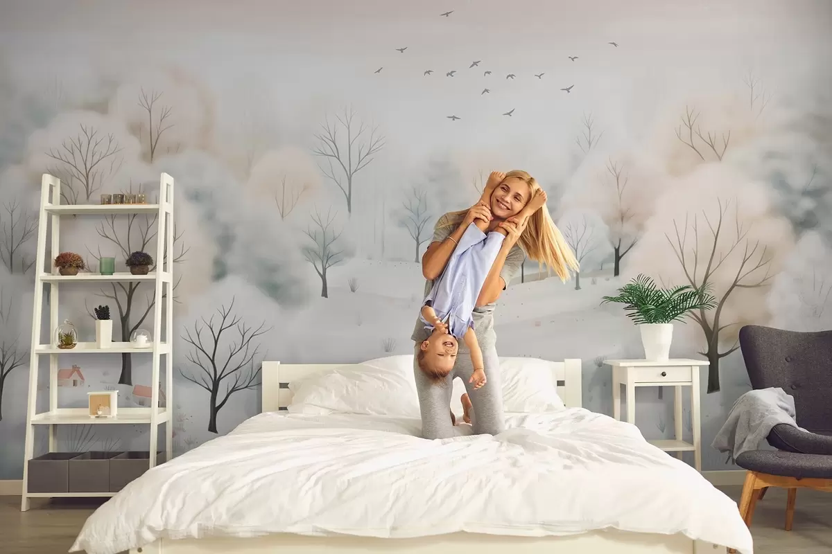 Фототапет Зимна гора с дървета, малки къщички, птици и сняг в лек акварелен стил Nr w08815