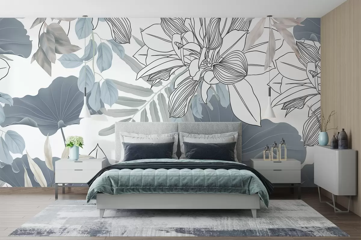 Фототапет Флорален принт с лотосови цветя и листа в синьо и бяло на бял фон Nr w08827