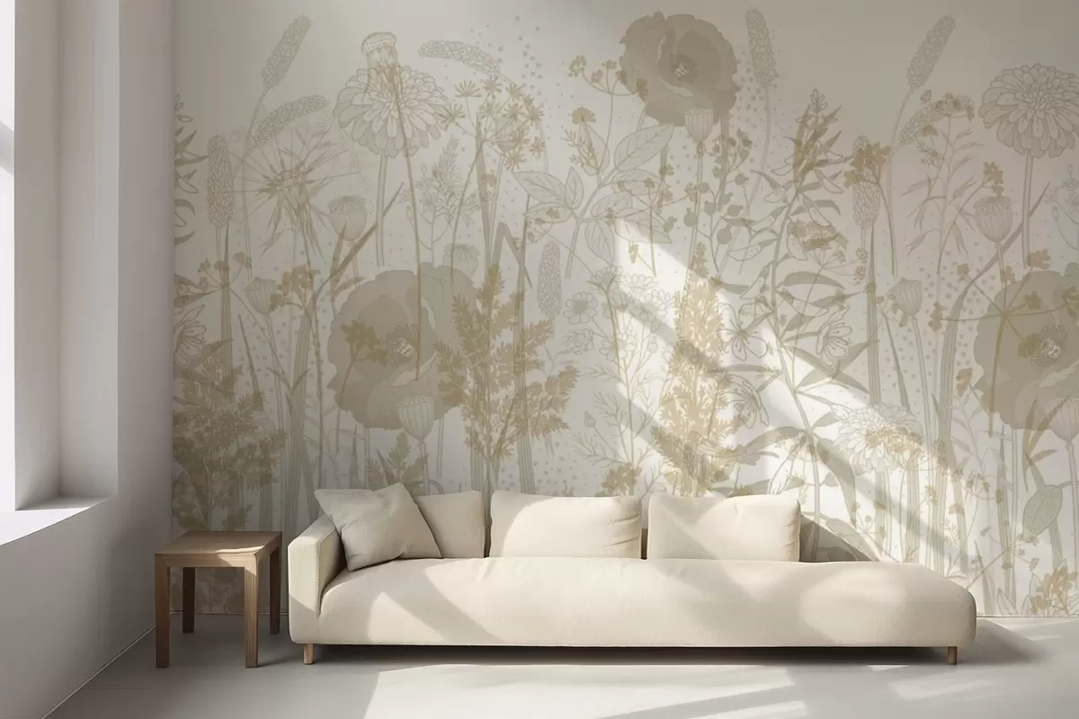 Фототапет Поле от високи цветя и трева в светлобежови пастелни тонове на бял фон Nr w08829v1