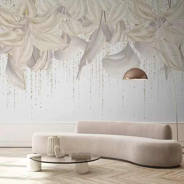 Фототапет Бяла детайлна текстура на тропически листа и жълти точки на бял фон Nr w08836