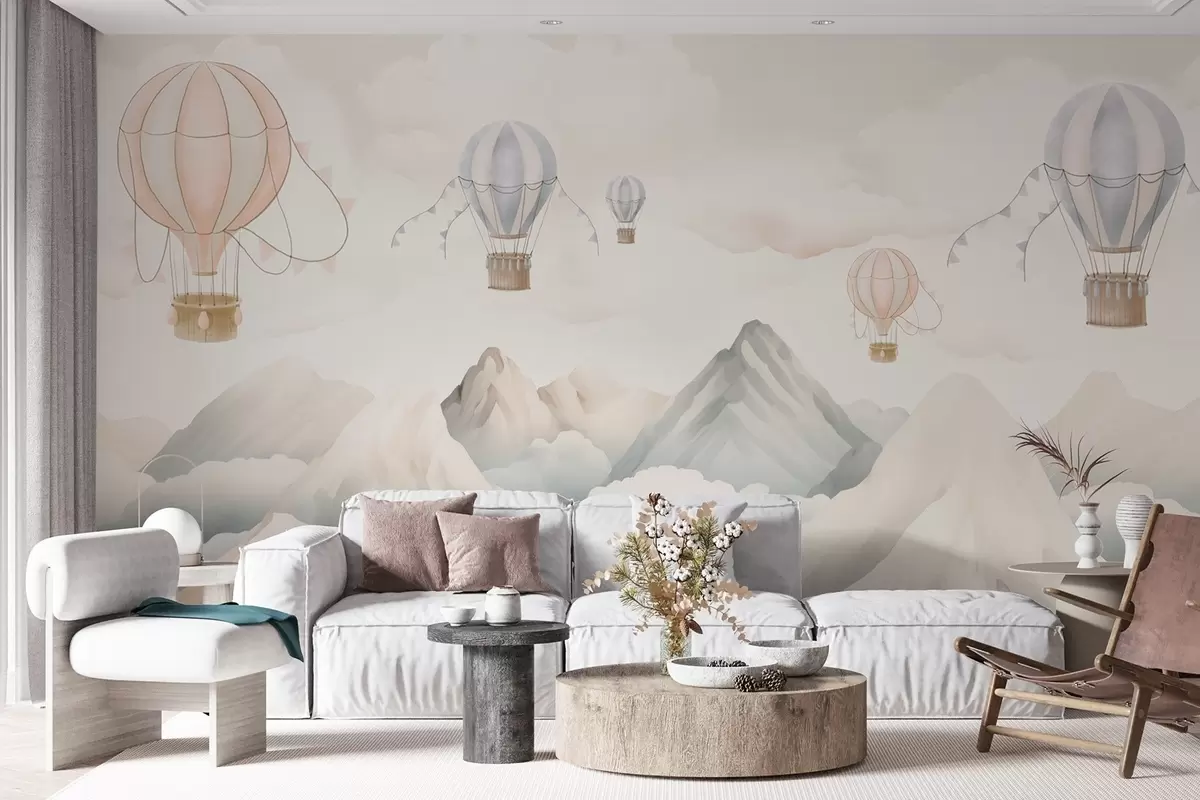 Фототапет Балони с горещ въздух, носещи се над планините, в неутрални, меки пастелни тонове Nr w08853