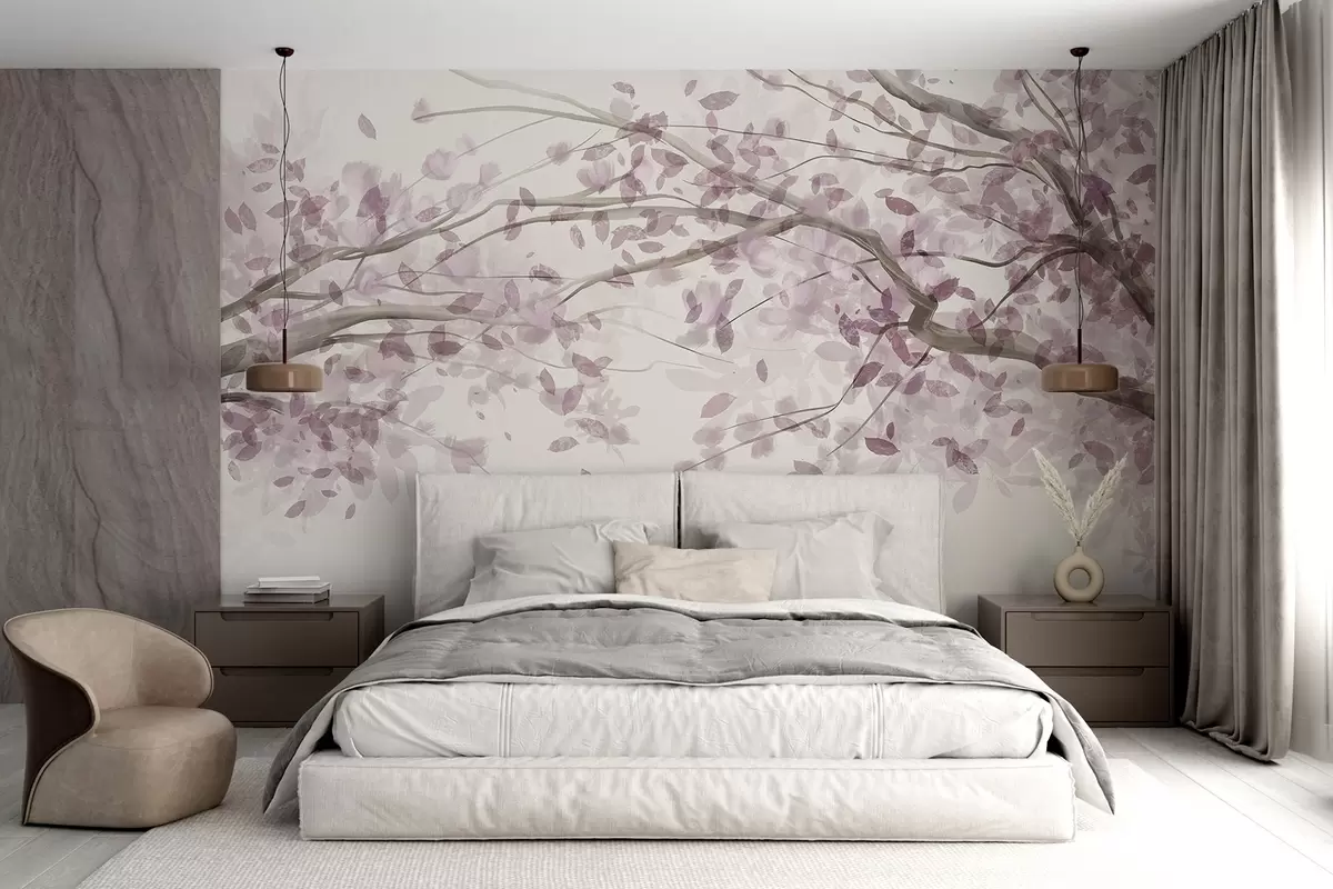Фототапет Цветни клони с розови листа, меки цветове, деликатни детайли, акварелен стил, на светъл фон Nr w08867