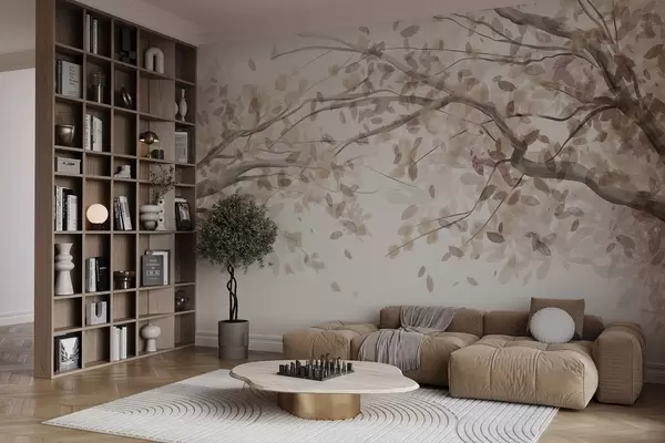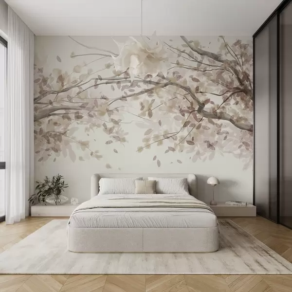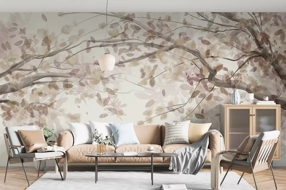 Фототапет Цветни клонки с бежови листа, меки цветове, деликатни детайли, акварелен стил, на светъл фон Nr w08867v1