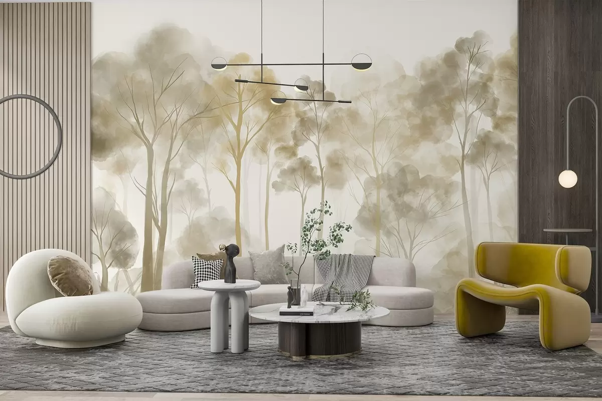 Фототапет Гора в акварелен стил с високи светли дървета в бежови и жълти нюанси, с мъглива атмосфера Nr w08870